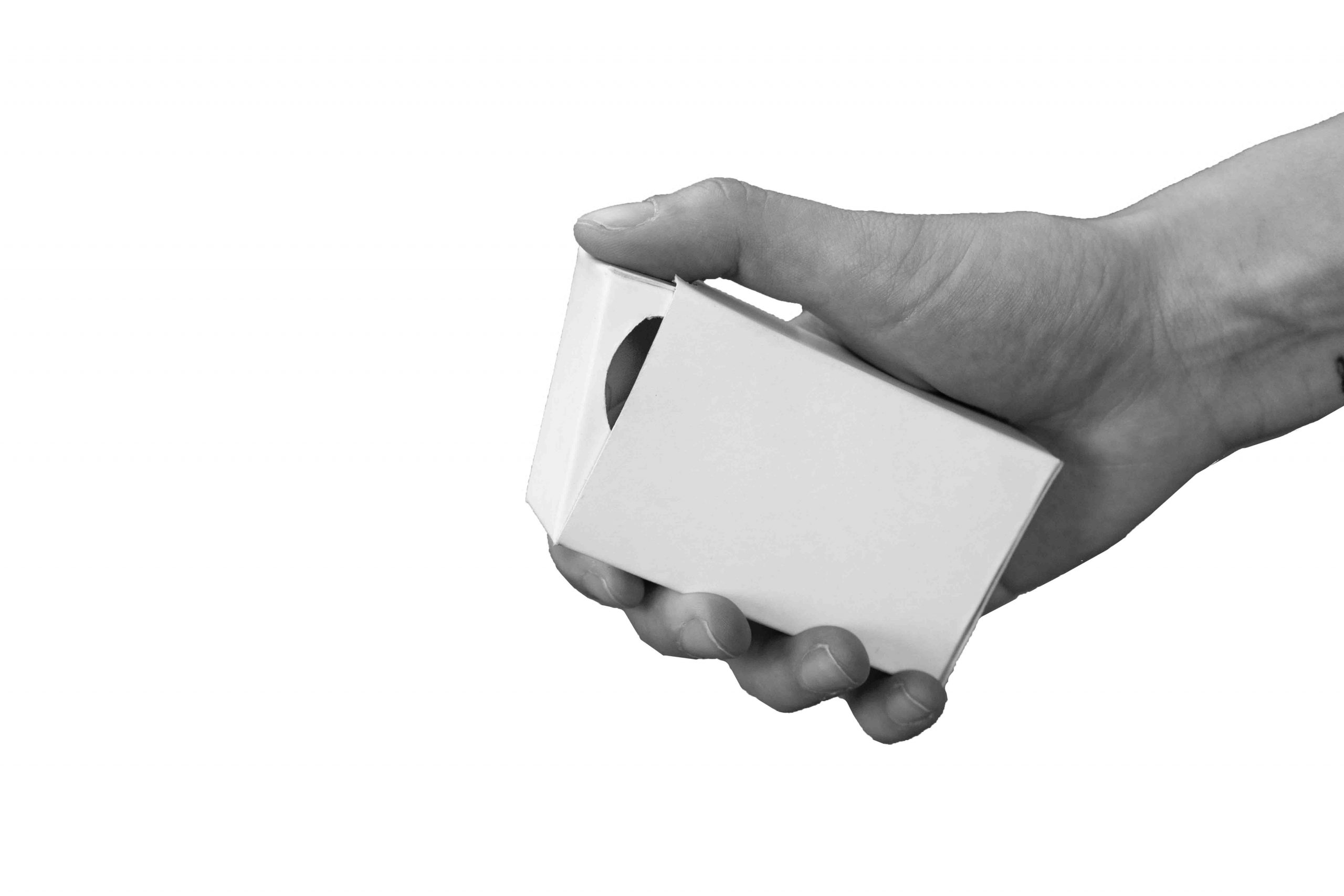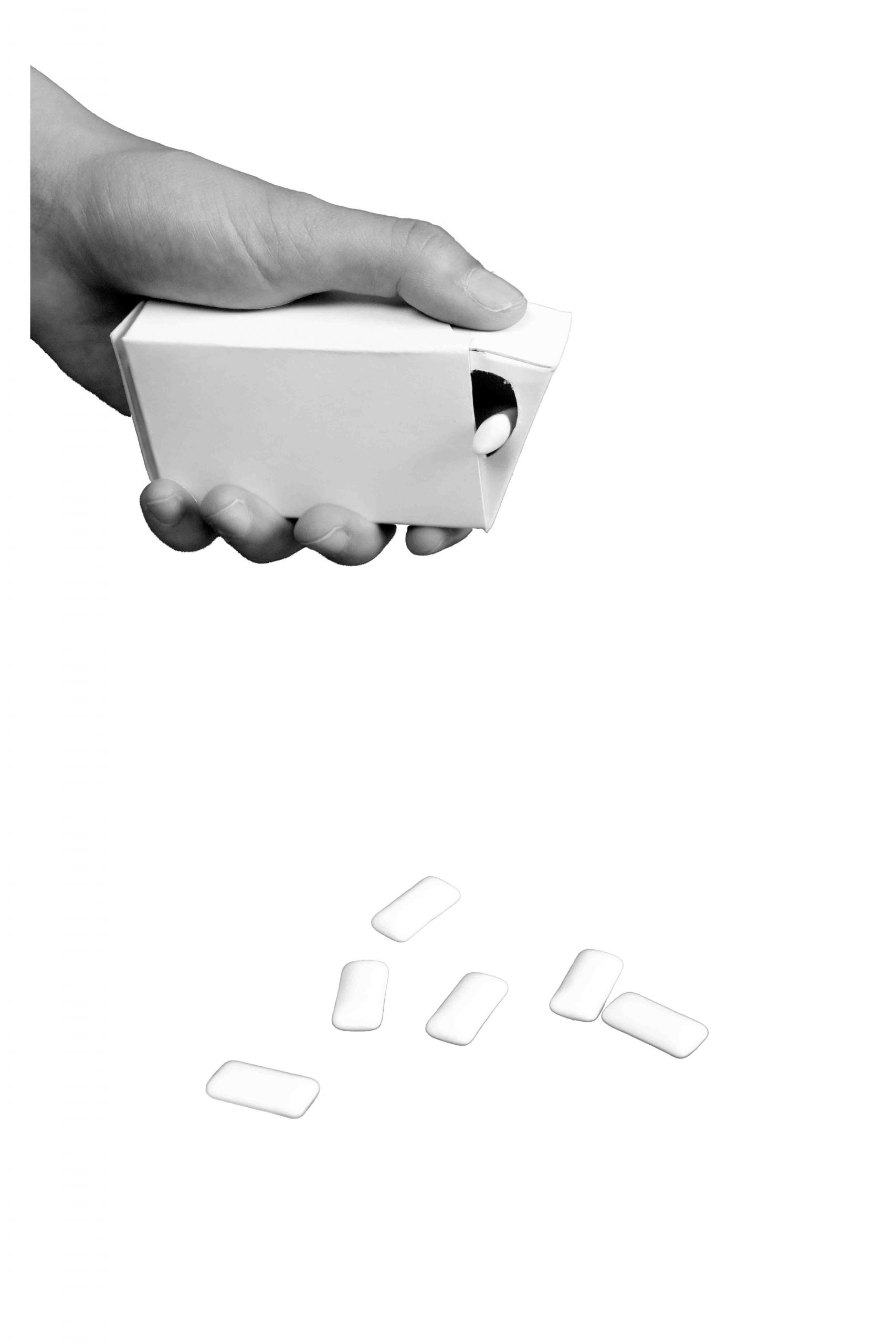 For this project, I decided to rethink the large plastic gum packaging into a cardboard version. But I wanted to make a packaging that has a simple pattern, requires little gluing, and is easy to open with one hand. With the correct dimensions, the lid can be pushed out and then stays in place. The opening is revealed, and the chewing gum can be shaken out.